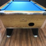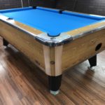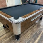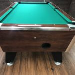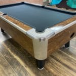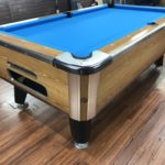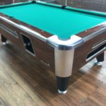 - New Hardware throughout|This table has some minor repaired chips and scratches but still looks great|New Championship Mercury Ultra green Cloth (retails for $100)|New pocket Liners and Gully Boots (retails for $40)|New locks throughout (retails for $12)|New Penguin wood and rubber rails (retails for $175)|Coin mechanism is set for free push