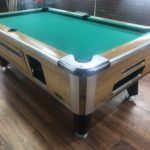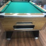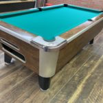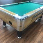 • New Championship Mercury Ultra Tournament Green Cloth|New Pocket Liners and Gully Boots|New Locks throughout|New Hardware throughout|New Penguin (Wood and Rubber) rails (Retails $165)|This table has some minor repaired chips and scratches but still looks great|Coin mechanism set for free push