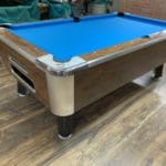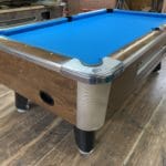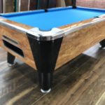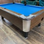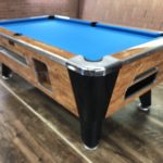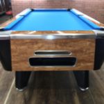 • New Hardware throughout|This table has some minor repaired chips and scratches but still looks great|New Simonis 860HR Tournament blue cloth (retails for $230)|Coin mechanism set for free push|New valley chrome rail trim (retails for $100)|New locks throughout the table (retails for $12)|New penguin wood and rubber (retails for $175)|New pocket liners and gully boots (retails for $40)
