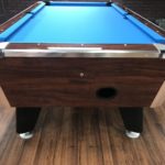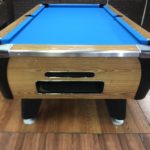 - New Hardware throughout|This table has some minor repaired chips and scratches but still looks great|New Simonis 860HR Tournament Blue Cloth (retails for $230)|New pocket Liners and Gully Boots (retails for $40)|New locks through out table (retails for $12)|New rail trim (Retails $100)|New Penguin wood and rubber rails (retails for $175)|Coin mechanism is set for free push
